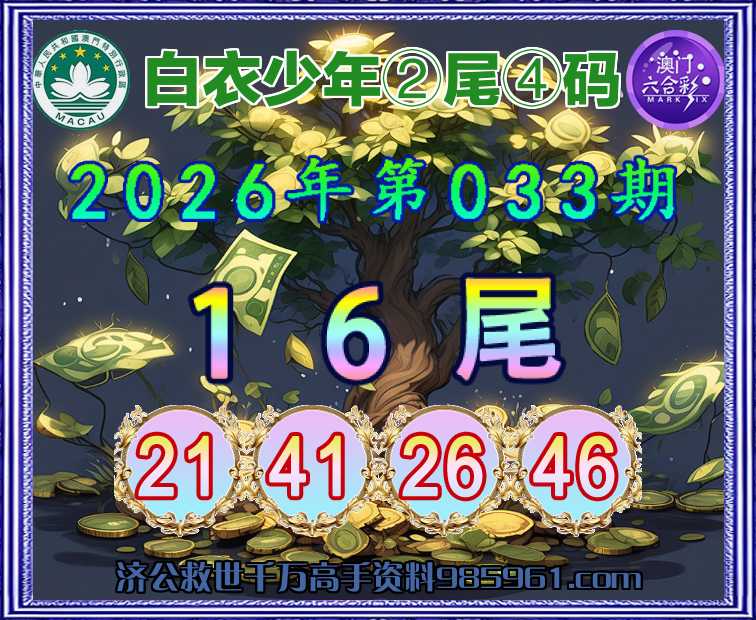 033期: 白衣少年 🧏♀️②尾④码🧏♀️【16尾主:21.41.26.46】开:41准